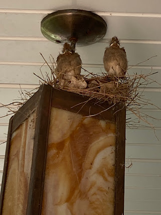 It's been flying away before when I left the house and I always thought it was just the lady cardinal, but Noooooo! It's a lady BLUEBIRD. Now mind you. We have 30 bluebird houses that Don constructed and installed in areas near and far. They are cleaned out every spring by yours truly. So why on earth is this bluebird lady taking over an old straggly Boston fern? No idea, but she is welcome and it will give me lots of entertainment keeping track of this new brood. Five tiny blue eggs. Lots more spying to do! I've done more posting in the past few days that the past few months.